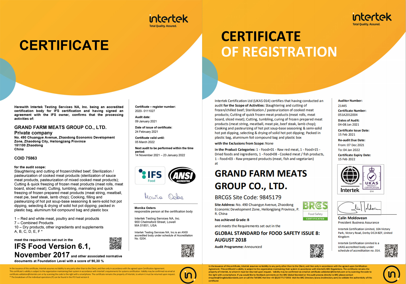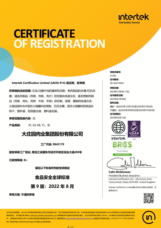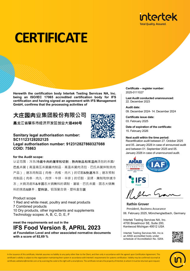 ,通過歐洲國際雙體系質(zhì)量認證(BRCGS、IFS)。2022年2月19日